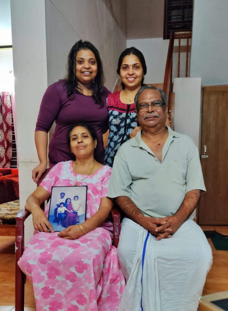 Even while securing laurels in his professional life, Achan never forgot to enjoy his life. He enjoyed the finer things life has to offer, and made a group of thick friends, with whom he always kept in touch. He worked hard to pay off debts in the family and helped marry off his sisters at an early age. He himself got married to Sathy Devi (my mother in law) in his mid thirties, and eventually fathered two daughters – Aparna and Archana (my wife) in the coming years. Family always came first for him, with Friends coming next. He ensured that his family was well-supported and saw his daughters securing higher education, landing excellent jobs, and starting their own families. He also had his own set of health scares in between before cancer, which included several medical procedures and two bypass surgeries. Yet, his jovial nature and indomitable spirit, helped him conquer all these challenges with a smile on his face.
